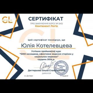 - Курс Project Management, Practical Leadership Skills, CRM-системи, Google Ads та Facebook Ads (2022–2023).