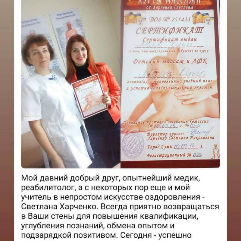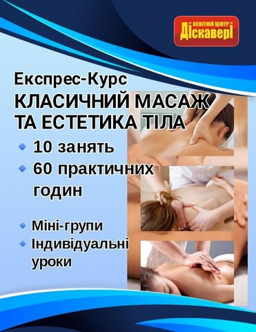 Авторський експрес-курс від Світлани Миколаївни Харченко "Класичний масаж та естетика тіла" - це 10% теоретичної підготовки і 90% практичних відпрацювань на реальних моделях. Навчання в міні-групі з 2-х студентів або індивідуально. Сертифікат встановленого зразка українською і англійською мовами.