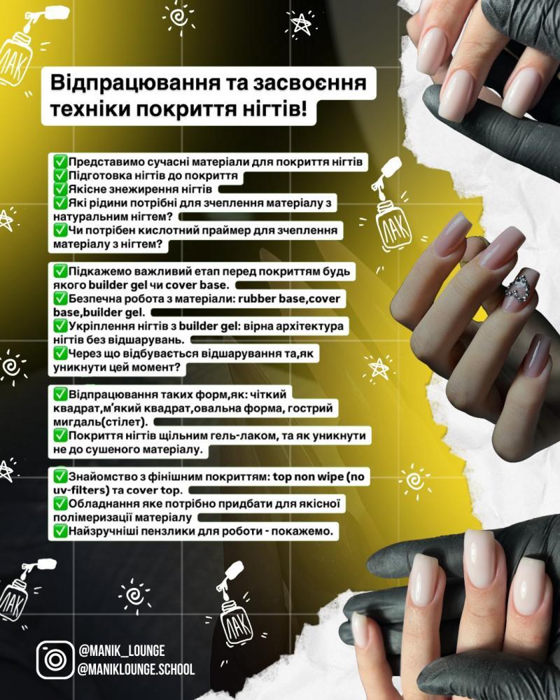 - Ознайомлення з матеріалами для покриття (Builder Base – міцний матеріал для реставрації та корекції нігтів, Гель-лаки, фінішне покриття)