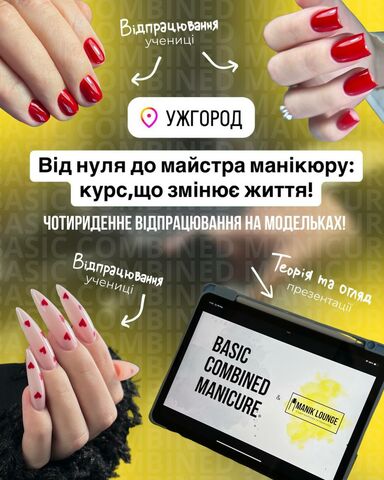 Курс Basic Combined Manicure призначений для тих, хто бажає освоїти комбінований манікюр, поєднуючи сучасні та класичні техніки. Програма включає теоретичну підготовку та інтенсивну практику з відпрацюванням на моделях.